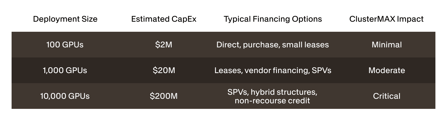 Dec 15, 2025|Strategies for financing large-scale GPU infrastructure (100 to 10,000 units), detailing operating leases, SPVs, vendor, and hybrid models.