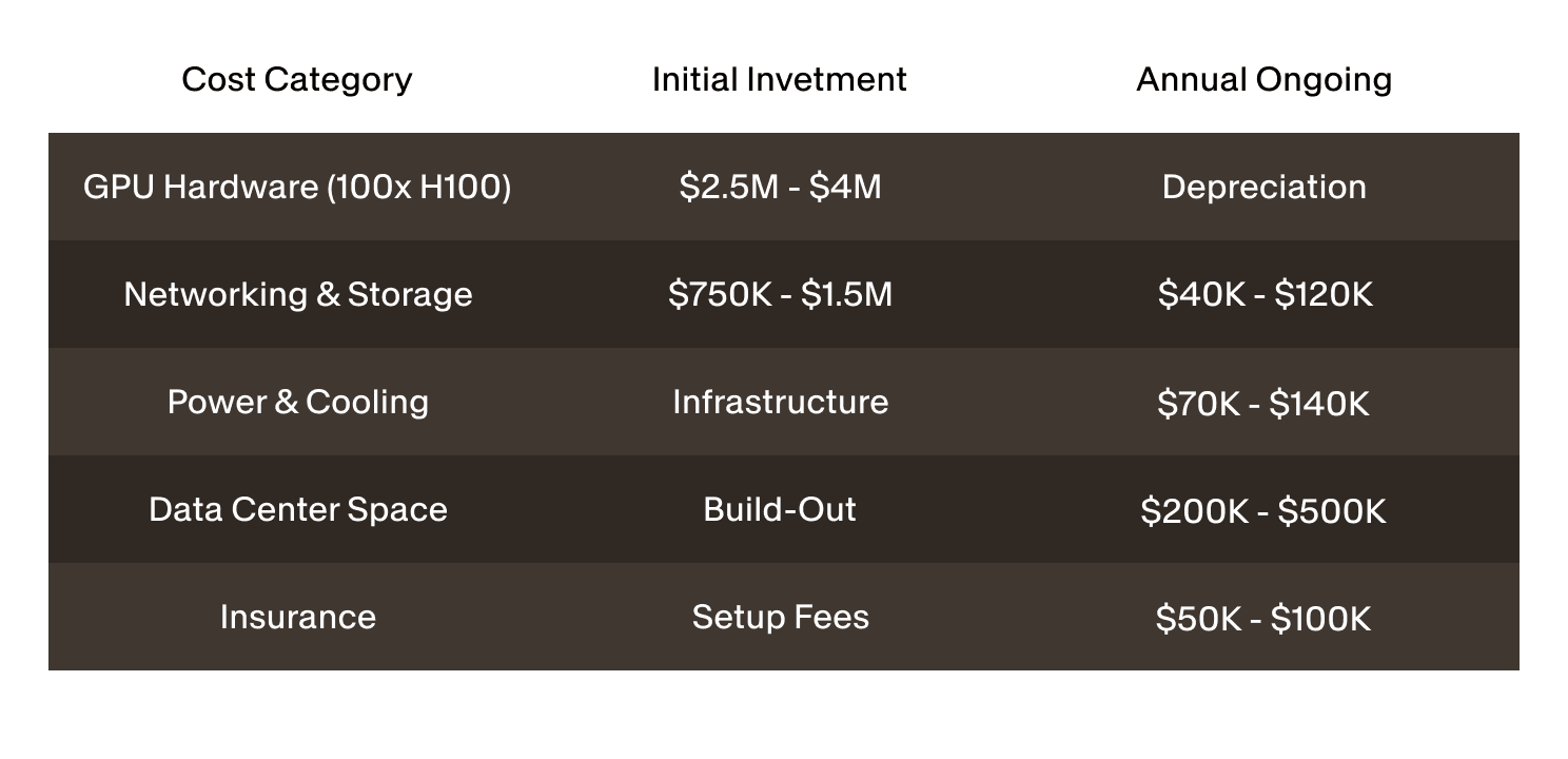The sticker price on GPUs represents just the starting point for AI infrastructure costs. A single NVIDIA H100 GPU costs between $25,000 and $40,000, but you'll also need networking equipment, power systems, cooling infrastructure, and rack space. These additional components typically add 30–50% to your hardware budget before you can run your first workload.