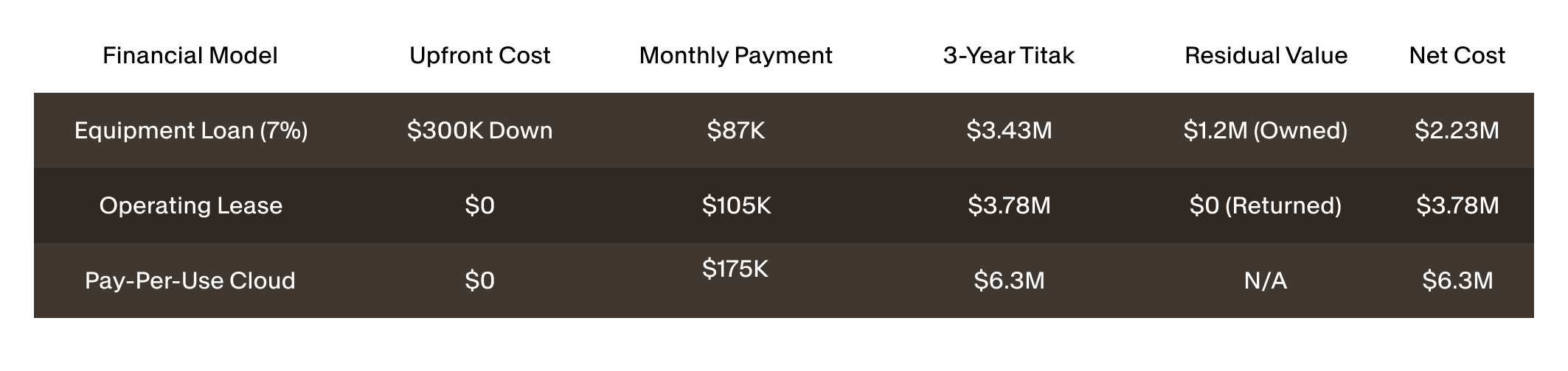 For a direct comparison, model each financing option over identical time horizons—typically 36 or 60 months. Here's a simplified example for a $3 million GPU deployment: